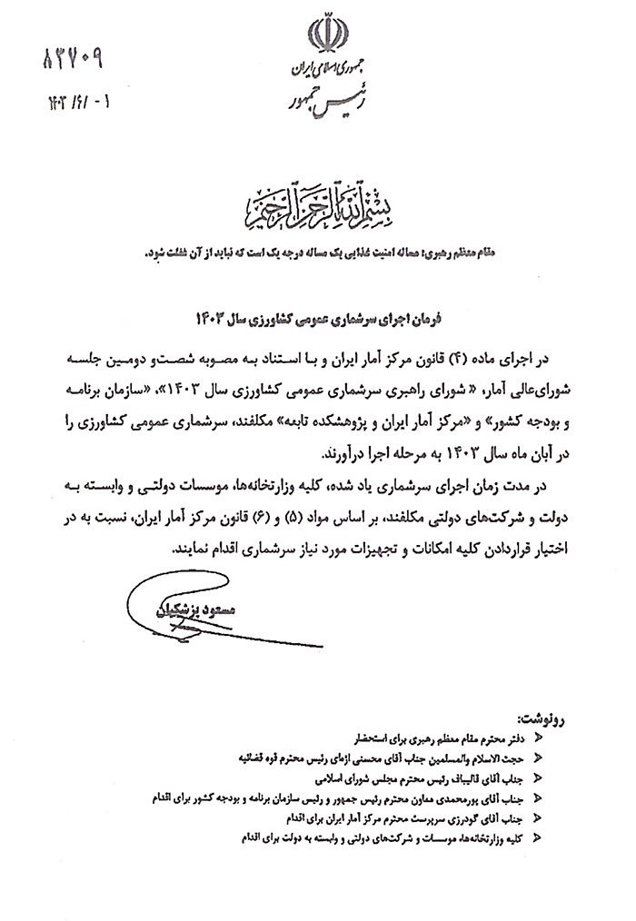 - مطابق ماده 3 قانون مرکز آمار ایران و ماده 10 قانون احکام دائمی برنامه توسعه کشور (بهمن 1395 )به منظور حفظ سری زمانی آمارهای بخش کشاورزی و بهنگام سازی بهره برداران کشاورزی، سرشماری یاد شده باید در پاییز سال 1403 اجرا شود.
